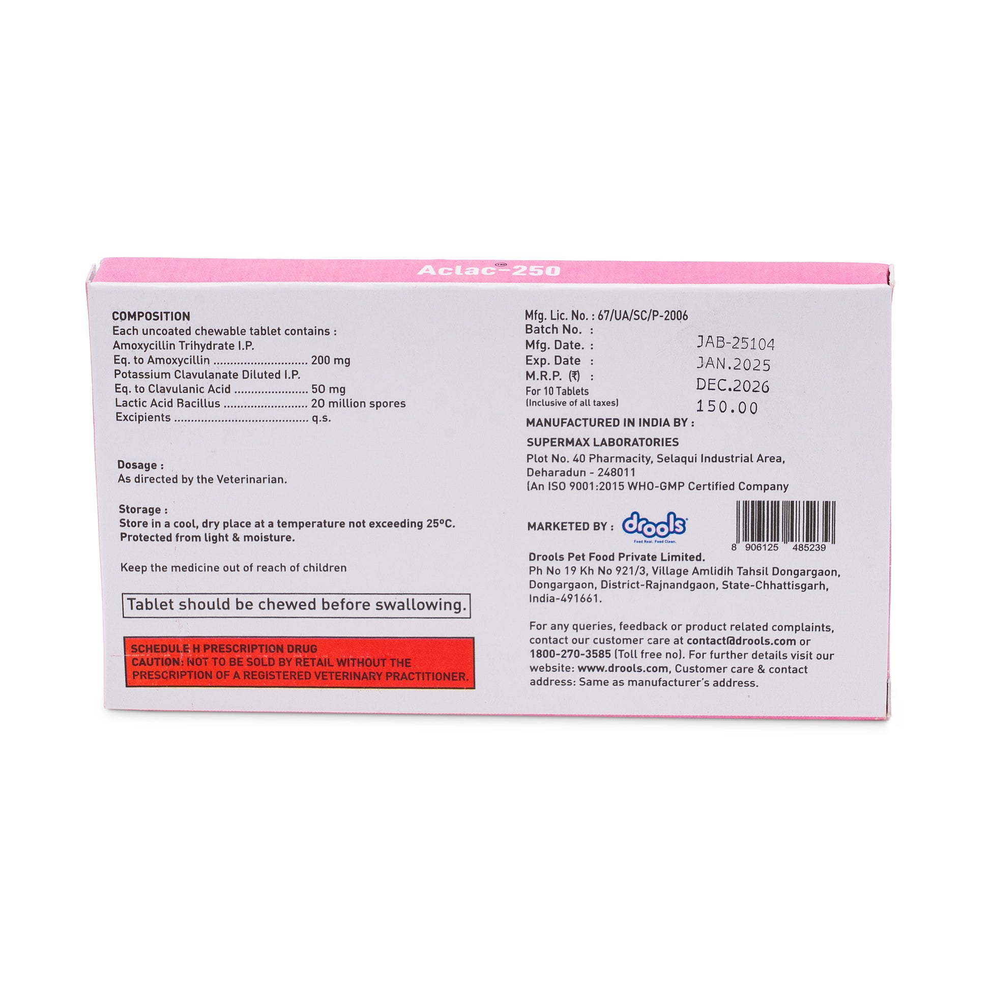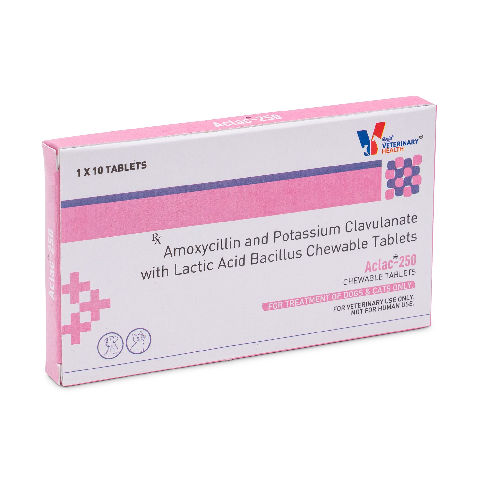 Aclac 250 mg is a broad-spectrum antibiotic containing Amoxicillin and Potassium Clavulanate, supported by Lactic Acid Bacillus spores to promote digestive stability during antibiotic therapy. This combination is formulated to target both gram-positive and gram-negative bacteria responsible for skin, soft-tissue and internal infections in cats and small-breed dogs.